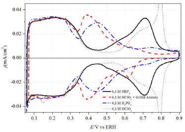 ![]() Figura 5. Voltamogramas cíclicos de Pt(111) na presença de diferentes ânions: 0,1 mol L-1 HBF4 (preto), 0,1 mol L-1 HClO4 + 0,01 mol L-1 acetato de sódio (vermelho), 0,1 mol L-1 H3PO4 (azul ) e 0,1 mol L-1 HClO4 (tracejado). Velocidade de Varredura: 50 mV s-1