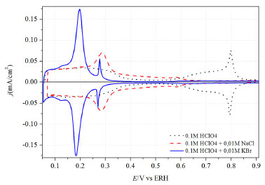 ![]() Figura 6. Voltamogramas cíclicos de Pt(111) na presença de diferentes ânions: 0,1 mol L-1 HClO4 (preto), 0,1 mol L-1 HClO4 + 0,01 mol L-1 NaCl (vermelho), 0,1 mol L-1 HClO4 + 0,01 mol L-1KBr (azul). Velocidade de Varredura: 50 mV s-1