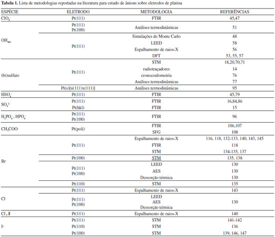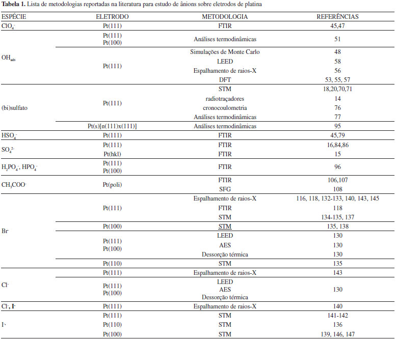 Além do uso da voltametria cíclica, um grande número de técnicas ex situ sensíveis à estrutura superficial como AES (Auger Electron Spectroscopy),129 LEED (Low Energy Electron Diffraction),129-131 espalhamento de raios-X116,118,131-133 e microscopia eletrônica de tunelamento (STM, do inglês Scanning Tunneling Microscopy)134-139 foram também empregadas para obter informações estruturais sobre haletos adsorvidos em Pt. Os estudos empregando as técnicas citadas mostraram que, dentro de um intervalo de potencial, camadas ordenadas desses ânions são formadas sobre a superfície de Pt. Em geral, os resultados obtidos pelos vários grupos e diferentes técnicas estão em boa concordância. Em Pt(111), os haletos formam predominantemente camadas empacotadas hexagonalmente, refletindo que as interações laterais entres os adsorbatos ocorrem isotopicamente. Estruturalmente, as camadas de adsorbato formadas por brometo ou iodeto sobre Pt(111) são bastante similares. Para o iodeto, duas estruturas são observadas, (√7×√7)R19.1º e (3×3),140-142 sendo que a última possui uma cobertura ligeiramente superior e é formada em potenciais mais positivos. Uma estrutura muito similar é também encontrada para adsorção de brometo em Pt(111), classificada como uma formação (3×3). A célula unitária desta estrutura contém 4 átomos de brometo/iodeto sobre 9 átomos de Pt, levando a uma cobertura de 4/9 da superfície (θBr=4/9).116,132-136,141-143 Em baixos potenciais, o íon cloreto não forma uma camada compacta ordenada e nenhuma estrutura de longa ordem sobre Pt(111).140 Para a superfície de Pt(100), os estudos a respeito da adsorção de adsorbatos não são tão abundantes comparados com Pt(111)144. Estudos utilizando STM em Pt(100) foram apresentados para adsorção de CO e iodeto145 e em condições in situ.138,139,146,147 No caso do iodeto, duas estruturas foram observadas, (√2×5√2)R45º139,145-147 em potenciais mais positivos (1 V) e (√2×√2)145-147 em potenciais mais baixos (0,5 V). Com respeito à adsorção de brometo em Pt(100), Bittner et al.135 relataram a existência de apenas uma estrutura superficial parcialmente ordenada, enquanto que Orts et al.137 mostraram estruturas ordenadas descritas como (3×4) - 6Br (θBr=0,5). Para superfícies escalonadas, onde há uma variação da densidade de sítios monocristalinos, Garcia-Araez et al.,127 utilizando diferentes eletrodos monocristalinos de platina de orientação Pt(2n-1, 1, 1) e Pt(n,1,0), mostraram que sobre essas superfícies a formação de uma estrutura ordenada de brometo se apresenta na forma de c(2×2) com cobertura (θBr=0,5). A diferença na estrutura foi analisada pelas diferentes interações entre as espécies adsorvidas nessas superfícies, já que diferentes orientações de sítios superficiais levam a diferentes energias de adsorção. A Tabela 1 apresenta, de forma compactada, as metodologias utilizadas em trabalhos já reportados na literatura para estudar a influência de ânions sobre eletrodos de platina.