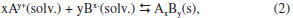 ASPECTOS GERAIS SOBRE A QUÍMICA DOS COLOIDES Define-se como um coloide um sistema composto por ao menos duas fases, sendo uma contínua (dispersante) e uma ou mais fases descontínuas (partículas dispersas) que possuem pelo menos uma de suas dimensões entre 1 nm e 1 µm, ou um sistema cujas descontinuidades encontram-se nessa faixa de tamanhos.36 Assim, grosso modo, o termo dispersão coloidal refere-se a sistemas intermediários entre as soluções (sistemas homogêneos cujas espécies dispersas têm dimensões moleculares) e as dispersões grosseiras (sistemas heterogêneos com tamanhos de partículas dispersas superiores a 10 µm).37 O termo "coloide" foi introduzido por Thomas Graham, considerado o pai da Química de Coloides, em 1861,38 significando "parecido com cola" (do grego "kolla" adicionado ao sufixo "oide", de "similar a"); o termo referia-se originalmente a materiais em solução/suspensão aquosa que possuíam baixa difusibilidade e eram incapazes de atravessar uma membrana de diálise. Originalmente, no entanto, atribui-se a Michael Faraday a invenção do termo em 1857, durante a apresentação de seu trabalho acerca dos efeitos da luz sobre suas famosas suspensões coloidais aquosas de ouro metálico.39 Os diferentes sistemas coloidais possíveis são atualmente classificados de acordo com a natureza das fases dispersa/dispersante envolvidas. Por exemplo, um coloide sólido/líquido é comumente chamado de "sol" (como as tintas); sistemas líquido/líquido são designados como "emulsões" (como o leite ou as microemulsões posteriormente descritas); coloides do tipo líquido/sólido são chamados de "géis" ou "emulsões sólidas"; sistemas líquido/gás são conhecidos como "aerossóis", entre outros.36,37 No que tange à síntese de nanopartículas inorgânicas, sistemas coloidais consistem em uma fase sólida, obtida por uma reação de precipitação, suspensa em uma fase contínua líquida, apresentando alto grau de dispersão das partículas e baixa taxa de aglomeração e sedimentação. Durante a síntese coloidal de nanopartículas, há dois processos, que ocorrem de maneira praticamente simultânea, a serem considerados: a nucleação (formação de numerosos cristalitos iniciais, em equilíbrio instável com o líquido parental) e o crescimento das partículas. A primeira teoria a tratar da influência de tais processos na obtenção de suspensões coloidais é o modelo de La Mer,40,41 originalmente desenvolvido para suspensões aquosas de enxofre coloidal. Atualmente, sabe-se que tal modelo é muito particular a esses sistemas e não se aplica diretamente à maioria dos coloides. Contudo, por sua ideia central de separação temporal entre nucleação e crescimento, o modelo serve de base para a elaboração de outros modelos bem como para o desenvolvimento de várias metodologias para a obtenção de coloides monodispersos. Para um sólido de fórmula AxBy, o produto de solubilidade (PS) das espécies iônicas em um determinado solvente pode ser escrito como: ![]() em que γ e C representam os coeficientes de atividade e as concentrações molares, respectivamente, das espécies envolvidas na precipitação. Se o sólido AxBy encontra-se em equilíbrio termodinâmico com sua solução parental, tem-se que: ![]() sendo que seu produto de solubilidade assume um valor constante (KPS) dado por: ![]() em que aA e aB são as atividades iônicas no equilíbrio termodinâmico, S é a solubilidade molar do sólido e x e y são os coeficientes estequiométricos. O grau de supersaturação (ΓS) pode ser definido como a razão entre o produto de solubilidade nas condições de saturação (nas quais as atividades são representadas por a') e o valor do KPS de equilíbrio termodinâmico: ![]() A equação anterior também pode ser expressa como a razão entre a concentração do soluto na saturação (CSAT) e sua concentração de equilíbrio (S). O grau de supersaturação pode ser considerado, portanto, como a força motriz do processo de precipitação, sendo que, quanto maior o valor da diferença CSAT-S, mais favorável será a formação do sólido. A Figura 1(a) ilustra o processo de precipitação segundo o modelo de La Mer com suas três etapas características: uma pré-nucleação, a nucleação e o crescimento. Inicialmente, partindo-se de uma solução insaturada em espécies precursoras do sólido, a concentração do soluto é inferior à concentração de supersaturação crítica, de modo que não se observa a formação de qualquer precipitado. A aplicação de uma ativação apropriada ou uma etapa de geração dos agentes precipitantes (por exemplo, por hidrólise ou (foto) oxidação/redução) leva ao aumento da concentração das espécies precursoras em valores acima da solubilidade de equilíbrio (S). Ao se atingir uma concentração de supersaturação mínima (Cmin), a fase de nucleação se inicia de maneira espontânea com a formação de germes iniciais (nucleação homogênea). A dimensão (R) dos núcleos formados nesse processo define o destino tomado por essas espécies. Os núcleos que possuírem um tamanho abaixo de um raio crítico de equilíbrio (R*) tendem a ser altamente instáveis e, dessa forma, são mais propensos a se redissolverem na solução. Já os núcleos com R>R* têm vida suficientemente longa para se submeterem à etapa de crescimento. O raio crítico de equilíbrio será tão menor quanto maior for o grau de supersaturação, ilustrando uma maior facilidade de nucleação para soluções de alto grau de supersaturação. Por outro lado, o valor de R* é diretamente proporcional à tensão interfacial sólido-líquido (entre o núcleo e a solução) e ao volume iônico do soluto; assim, o raio crítico de equilíbrio é um reflexo direto da energia livre de ativação para a formação do núcleo.42,43