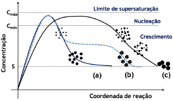 ![]() Figura 1. Ilustraçao de mecanismos de precipitaçoes coloidais que levam a partículas monodispersas: (a) modelo de La Mer, (b) modelo de Ocaña e (c) modelo de Sugimoto