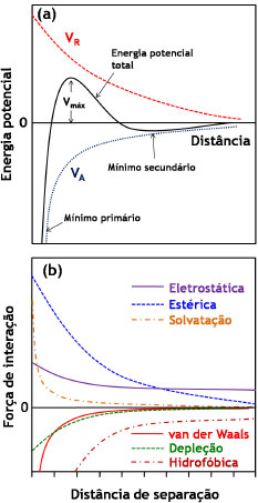 ![]() Figura 2. (a) Balanço dos potenciais de repulsao (VR) e atraçao (VA) entre partículas de acordo com a teoria DLVO. (b) Diagrama representando as possíveis forças atrativas (abaixo do eixo das abscissas) e repulsivas (acima das abscissas) atuantes entre partículas em suspensao