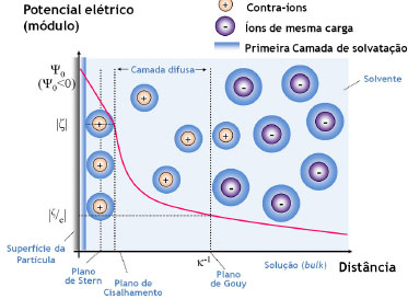 ![]() Figura 3. Ilustraçao do modelo de dupla camada elétrica e da variaçao do potencial elétrico (ψ0) em funçao distância a partir da superfície de uma partícula coloidal (no caso, de carga superficial negativa), com a representaçao do arranjo de contra-íons e co-íons em suas proximidades na presença das respectivas camadas de solvataçao37