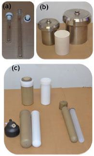 ![]() Figura 4. Alguns sistemas utilizados em reaçoes hidro- e solvotermais: (a) tubos selados de paredes de vidro espesso (com tampas de Teflon vedadas por O-rings), (b) autoclaves de aço inox com recipientes internos de Teflon, e (c) tubos de Teflon jaquetados com invólucros cerâmicos para reaçoes com irradiaçao por micro-ondas