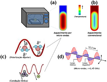 ![]() Figura 5. Ilustraçao (a) do perfil de aquecimento de amostras sob irradiaçao de micro-ondas em comparaçao ao (b) perfil de aquecimento convencional (conduçao/convecçao), e (c) representaçao dos mecanismos de aquecimento (polarizaçao dipolar e conduçao iônica) envolvidos nos processos químicos induzidos pelas micro-ondas, descritas figurativamente em (d)