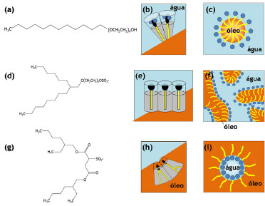 ![]() Figura 6. Ilustraçao da influência da cadeia carbônica do surfactante [(a),(d),(g)] na organizaçao interfacial [(b),(e),(h)] e na estrutura dos agregados micelares [(c),(f),(i)] em microemulsoes: (a)-(c) álcool etoxilado formando microemulsoes óleo/água; (d)-(f) éter-sulfato de cadeia ramificada para a composiçao de microemulsoes bicontínuas; e (g)-(i) sulfonato de cadeia dupla gerando microemulsoes água/óleo46