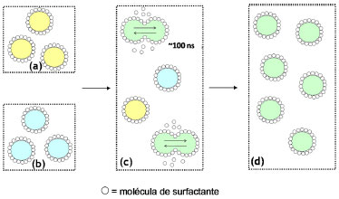 ![]() Figura 7. Representaçao esquemática do processo de dispersao dos solubilizatos das microemulsoes precursoras (a) e (b) através da colisao entre micelas reversas, com a formaçao dos dímeros de vida curta nos quais ocorre a mistura das fases aquosas (c), o que é seguido pela dissociaçao das micelas e formaçao de agregados com conteúdo homogeneizado (d)