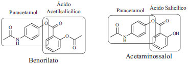 ![]() Figura 2. Estruturas químicas do benorilato e do acetaminossalol, híbridos obtidos por HM do tipo droga-droga
