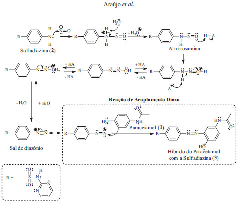 ![]() Figura 3. Mecanismo da reação de acoplamento azo entre o paracetamol (1) e a sulfadiazina (2) para a formação do híbrido (3), o protótipo da aula experimental
