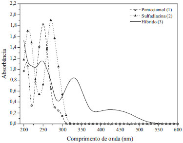 ![]() Figura 4. Espectros de UV-Vis das matérias-primas (1) e (2) e do produto reacional (3) na concentração de 50 ppm