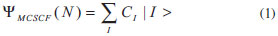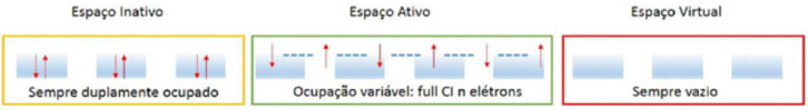 É importantíssimo ressaltar que os orbitais moleculares devem ser, obrigatoriamente, colocados na sequência apresentada acima (inativo, ativo e virtual) antes do cálculo CASSCF ser realizado. Portanto, o conjunto inicial de orbitais moleculares deve ser construído após uma análise criteriosa dos orbitais disponíveis, para que eles possam ser ordenados corretamente antes de executar o cálculo CASSCF. Para facilitar a análise dos orbitais moleculares pode-se recorrer a programas de visualização como, por exemplo, o MOLDEN,18 GABEDIT19 e Jmol.20 Supondo que os orbitais iniciais estejam na ordem correta, o espaço de configurações que será usado para formar a função de onda multiconfiguracional (Equação 1) é construído. Em seguida, aplicando o método variacional, os coeficientes CI e os orbitais moleculares (inativos e ativos) serão otimizados.