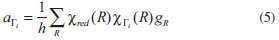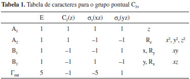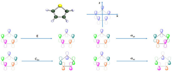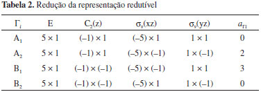 O processo para obter o número de orbitais moleculares pertencentes a cada uma das representações irredutíveis envolve dois passos: (i) obtenção da representação redutível, empregando como funções base os orbitais atômicos que irão formar os orbitais moleculares e (ii) decomposição da representação redutível em termos das representações irredutíveis do grupo pontual da molécula em estudo. Como conjunto base para as operações de simetria, podemos empregar os orbitais atômicos utilizados para construir os orbitais moleculares do espaço ati, , vo. Neste caso, estamos interessados nos orbitais moleculares π, π* e nS. Supondo que a molécula esteja no plano molecular xz (Figura 9), empregaremos os orbitais atômicos py (perpendiculares ao plano xz), para construir os orbitais moleculares π e π*, e o orbital atômico s do enxofre como orbital nS. Orbitais do tipo n são totalmente simétricos e, portanto, pertencem à representação irredutível A1. Uma maneira prática de se obter uma representação redutível é contar o número de funções base, neste caso os orbitais atômicos que irão compor os orbitais moleculares π, que permanecem fixos no mesmo átomo em relação a cada uma das operações do grupo pontual ao qual a molécula pertence. Cada função base que permanecer com o mesmo sinal contribuirá com 1 para o caracter da operação correspondente na representação redutível; cada função que permanecer no mesmo átomo, porém com sinal contrário, contribuirá com -1 para o caracter da operação na representação redutível. Se a função não permanecer no mesmo átomo, ela não contribuirá para o caracter da operação na representação redutível. Na Figura 9 representamos os cinco orbitais py nos átomos de carbono e enxofre da molécula de tiofeno. Na mesma figura, representamos o resultado de cada uma das operações de simetria do grupo pontual C2v. A representação redutível (Γred) obtida como descrito na sequência do texto também pode ser vista na Tabela 1. Após a realização da operação identidade (E), todos (5 funções) os orbitais permanecem na mesma posição; logo, o caracter da operação identidade na representação redutível é 5. Em relação à operação C2(z), todos os orbitais atômicos mudam de posição, exceção ao orbital centrado no átomo de enxofre, que permanece nele com sinal trocado; logo, o caracter da operação C2(z) na representação redutível é -1. Em relação à operação σxz, todas as funções permanecem em seus átomos de origem, porém com sinal trocado; portanto, seu caracter na representação redutível será -5. Finalmente, para a operação de simetria σyz, todas as funções mudam de posição, exceto a localizada no átomo de carbono que permanece nele com o mesmo sinal; assim, o caracter da operação σxz na representação redutível é 1. Para grupos de ordem finita,42,43 a redução de uma representação redutível pode ser feita pela seguinte equação: ![]() na qual, aΓi corresponde ao número de vezes que a representação irredutível Γi aparece na representação redutível; h é a ordem do grupo pontual; R é a operação de simetria; χred(R) é o caracter da operação R na representação redutível Γred; χi(R) é o caracter da operação R na representação irredutível Γi; gR é o número de membros da classe à qual a operação R pertence. Na Tabela 2, ilustramos o uso da Equação 5 no nosso caso; lembre-se que a ordem do grupo pontual C2v é igual a 4.