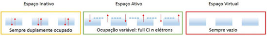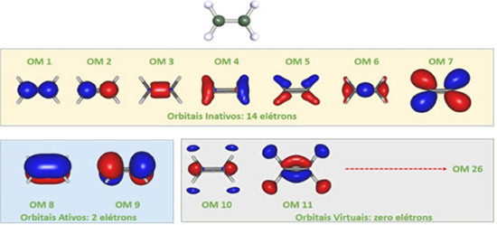 ![]() Figura 2. Orbitais moleculares inativos, ativos e virtuais para o etileno. Estao representados os 11 primeiros orbitais moleculares canônicos obtidos com o método RHF e bases atômicas 6-31G, na geometria otimizada no mesmo nível de cálculo. Os orbitais estao ordenados na sequência energética obtida pelo cálculo