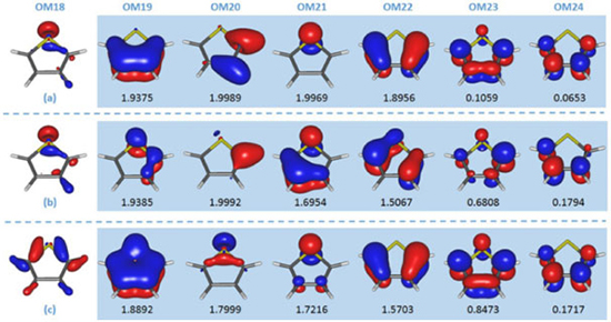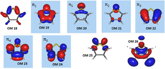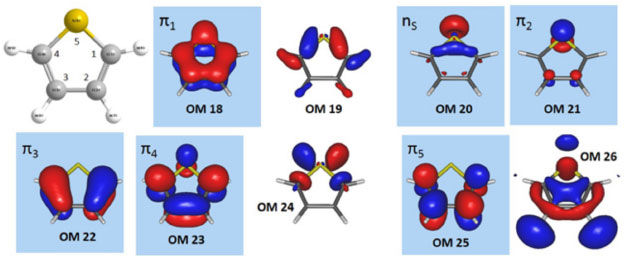 Na Figura 3, os orbitais moleculares 18, 19, 20, 21, 22, 23, 24, e 25, são apresentados na sequência gerada pelo cálculo RHF. Antes de prosseguir, devemos mencionar que os orbitais gerados pelo método RHF são ordenados seguindo critérios energéticos (maior energia, mais interno, para menor energia, mais externo). Como orbitais do mesmo tipo podem ter energias distintas, diferentes tipos de orbitais estarão dispostos sequencialmente seguindo a ordem energética, como acontece neste exemplo (Figura 3) no qual temos um do tipo σ (envolvendo ligações carbono-carbono e carbono-hidrogênio, OM19) na sequência de orbitais que estaria no espaço ativo; certamente ele não é relevante para descrever as transições eletrônicas π → π* e n → π* do tiofeno. Observando a sequência de orbitais apresentada na Figura 3, notamos alguns problemas: