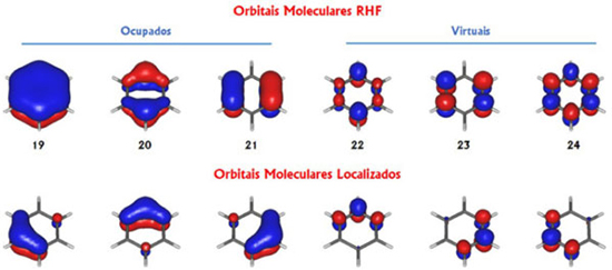 ![]() Figura 5. Três últimos orbitais moleculares canônicos ocupados e os três primeiros orbitais canônicos virtuais para a molécula de benzeno, obtidos com o método RHF e conjuntos mínimos (C : 2s1p/H : 1s) de bases atômicas do tipo ANO (atomic natural orbitals), na geometria de equilíbrio obtida no mesmo nível de cálculo. Parte superior: orbitais canônicos; parte inferior: orbitais localizados de acordo com procedimento proposto por Pipek e Mezey