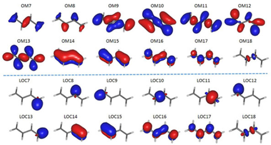 ![]() Figura 6. Alguns orbitais moleculares canônicos (ocupados e virtuais) para a molécula de butadieno, obtidos com o método RHF e conjuntos mínimos de bases atômicas do tipo ANO (atomic natural orbitals), na geometria de equilíbrio obtida no mesmo nível de cálculo. Parte superior: orbitais canônicos; parte inferior: orbitais localizados de acordo com procedimento proposto por Pipek e Mezey