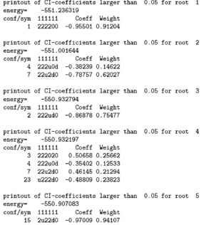 Na saída gerada pelo programa, encontramos o índice da configuração eletrônica e a respectiva ocupação dos orbitais ativos (sequência de 6 números, um para cada orbital do espaço ativo), na segunda coluna. Note que os orbitais ativos estão ordenados conforme sequência analisada no item anterior e ilustrada na Figura 7c. Normalmente, os orbitais ativos ocupados recebem o número 2 ou 1, indicando que ele está ocupado por 2 ou 1 elétron, respectivamente; o orbital ativo vazio é indicado pelo número zero. Na saída do MOLCAS, os orbitais unicamente ocupados são identificados pelas letras u e d, que representa elétrons com spin up ou spin down, respectivamente. Note que, neste caso, não se trata de ocupação de orbitais naturais, mas sim de uma representação de configurações eletrônicas. Acima das configurações eletrônicas (topo da 2a. coluna, 111111), encontramos o índice que indica a simetria espacial de cada um dos orbitais moleculares que compõem o espaço ativo; como anteriormente, temos 6 números representando a simetria espacial dos 6 orbitais moleculares do espaço ativo. Neste caso, estamos trabalhando com o grupo pontual C1 e, portanto, todos os orbitais moleculares pertencem à representação irredutível A, a única presente no grupo pontual C1. Na terceira coluna, temos o coeficiente CI da configuração eletrônica (cujo módulo quadrado é seu peso na expansão CASSCF, indicado na quarta coluna); quanto maior for o coeficiente (peso) de uma configuração, maior será sua participação na função de onda CASSCF.