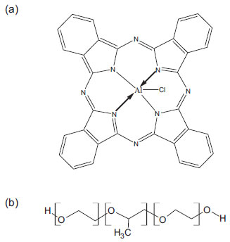 ![]() Figure 1. Molecular structure of (a) aluminum phthalocyanine chloride and (b) Pluronic® block copolymer. (x=z=20 and y =70 for P-123 and x=z=106 and y=70 for F-127)