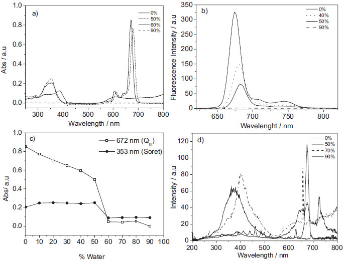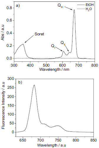 RESULTS AND DISCUSSION Spectroscopic properties and solubility of AlPcCl in homogeneous media: electronic absorption and fluorescence studies Firstly, AlPcCl is insoluble in water, being precipitated without showing any absorption band in this media (Figure 2-a). Poor solubility was also observed in other solvents, where there was a verified decrease and enlargement in different degree of principal bands of AlPcCl in monomeric state in the following order: CHCl3 > acetone > DMSO (Dimethyl Sulfoxide). On the other hand, their solubility is significantly increased in ethanol, as can be seen in Figure 2-a. The absorption spectrum shows two major bands, attributed to π-π* HOMO-LUMO transitions, centered at 353 (Soret band, S0 → S2) and 672 nm (QI band, S0 → S1), which are characteristic of phthalocyanines in monomeric state.22 Besides the QI band a1u → eg symmetry, there were two other Q bands, labeled QII (606 nm) and QIII (640 nm), which were assigned to vibrational transitions, Q (1,0) and Q (2,0), respectively.22 The emission spectrum of AlPcCl in ethanol shows an emission maximum at a wavelength of 680 nm (Figure 2-b), relative to the S1 → S0 transition and two additional bands of lesser intensity at 713 and 748 nm, related to vibrational state transitions.23 The emission spectra of AlPcCl in acetone and DMSO (not shown) were similar to that obtained in ethanol, showing only a lower intensity, probably due to dye self-aggregation, which was more evident in these solvents.