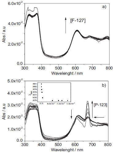 The tendency of AlPcCl to self-aggregate in the water-rich medium is attributed to an unbalanced hydrophilic/hydrophobic system due to the presence of water, which promotes hydrophobic interactions between AlPcCl molecules. This phenomenon has been reported in the literature for similar compounds.25,28,29 These that involve the spectroscopic properties of AlPcCl in homogeneous media constituted of binary mixtures water/ethanol are important to understand better the aggregation process of AlPcCl in media of high content of water. These studies also are important to understand the self-aggregates forms of AlPcCl in micro-heterogeneous media constituted of polymeric micelles of P-123 and F-127, describe after. Studies of physicochemical properties of AlPcCl in micro-heterogeneous nanostructured systems: P-123 and F-127 Polymeric Micelles Binding Isotherms of AlPcCl in polymeric micellar systems of P-123 and F-127 The UV-Vis absorption spectra obtained for the titrations of AlPcCl (8.0x10-7 mol L-1) with both copolymers at the initial time at 25.0 ºC are shown in Figure 4. Without copolymer addition, the spectral profile of self-aggregated AlPcCl becomes evident mainly through the presence of the characteristic aggregate band at 610 nm (Figure 3-a). No significant spectral changes were observed for the AlPcCl/F-127 system (Figure 4-a), but the system AlPcCl/P-123 showed a slight recovery in the band related to the absorption by AlPcCl monomers (λ = 675 nm) (Figure 4-b) and a decrease in the band related to the self-aggregates at λ = 610 nm with the addition of the copolymer. Additionally, in the inset shown in Figure 4-b, the increased concentration of P-123 induced a hypsochromic shift of the wavelength of maximum absorption at 675 nm (Δλ = 7 nm). These results suggest that the interaction of AlPcCl molecules with P-123 induced a greater breakdown effect and a structural reorganization of the different types of AlPcCl self-aggregates by the more hydrophobic copolymer.