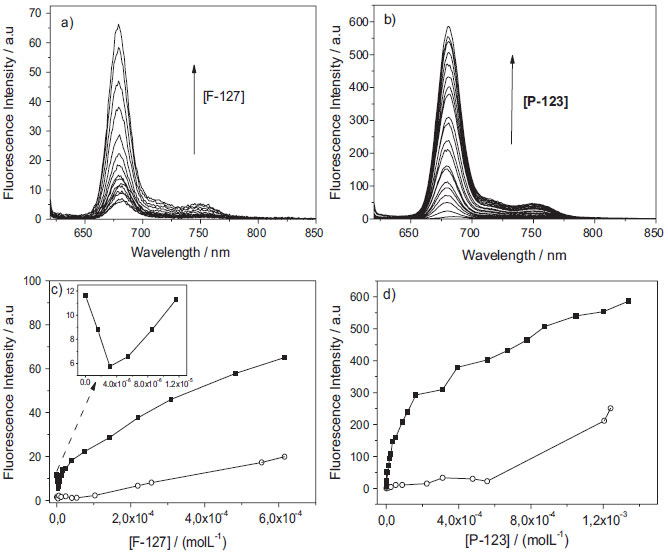 Figure 5. Fluorescence emission spectra of AlPcCl (8.0x10-7 mol L-1) and binding isotherm as a function of the addition of copolymers being: a) and c) F-127 (0 to 6.5x10-4 mol L-1), b) and d) P-123 (0 to 1.5x10-3 mol L-1) at pH = 6.9, λexc = 604 nm, 25.0 ºC. The arrow shows the increase in fluorescence emission with concentration of copolymers. Fluorescence emission obtained immediately after the addition of the copolymer (■; t= 0) and after equilibrium (○; t > 48 h) at pH 6.9, 25.0 ºC. The inset in Figure 5-c shows the isotherm region for low concentrations of F-127 (0 to 1.2x10-5 mol L-1)
