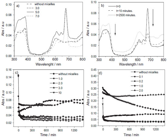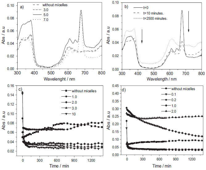 Figure 6. Absorption spectra of a) AlPcCl (2.5x10-6 mol L-1) at various [F-127mic]/ [AlPcCl] ratios (varying from no micelle to 7.0 and [F-127] from 0 to 6.2 x10-4 mol L-1), T= 25.0 ºC b) absorption spectra of AlPcCl (2.5x10-6 mol L-1) in F-127 (6.2x10-4 mol L-1; [F-127mic]/[AlPcCl] ratio = 7.0) at different times, T = 25.0 ºC. Temporal variation of absorbance of AlPcCl (2.5x10-6 mol L-1) in band QIII (λmax = 677 nm) at different [copolymermic] /[AlPcCl] ratios, c) F-127 (0 to 6.2 x10-4 mol L-1) and d) P-123 (0 to 1.5x10-3 mol L-1) at 25.0 ºC, pH = 6.9