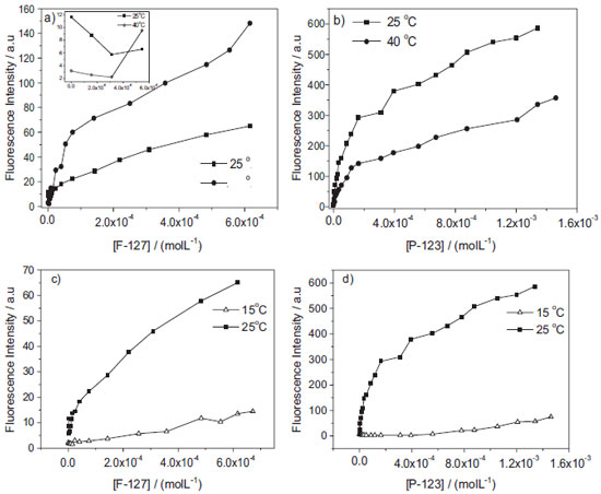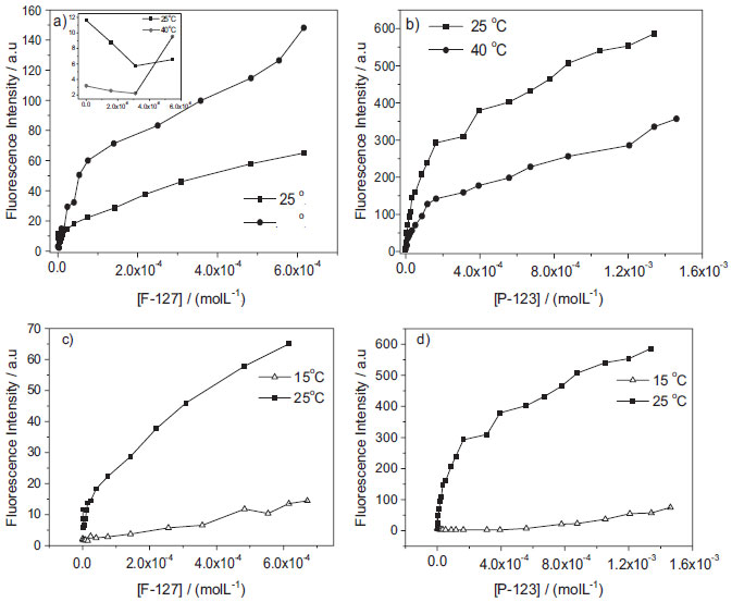 Additionally, we have tried to fit the kinetic profile curves of AlPcCl for different [copolymer]/[AlPcCl] ratios to known kinetic models and observed that the system is inherently complex and does not provide reliable kinetic relations. The kinetic effects observed in the AlPcCl/copolymers interaction (Figures 6-c and 6-d) reinforced the hypothesis of diffusional processes directly associated with the interaction of different forms of self-organized AlPcCl (dependent on the [AlPcCl]/[micelle] ratio and [micelle]) in micro-environments of different types of polymer micelles. The relatively faster aggregation of AlPcCl in F-127, together with the spectroscopic results of the interaction between phthalocyanine and the polymeric micelles (binding isotherm), showed the dependence of the AlPcCl-poloxamer interaction on the polymer micelle structure, which has a relatively more hydrophilic region formed by the organization of PEO groups when compared to P-123. In addition to the absolute size of the polymeric micelles, one should also consider that both copolymers possess different aggregation numbers (number of unimers in the copolymer per micelle) at 25.0 ºC (Nagg/F-127=37 and Nagg/P-123 = 86 at 25.0 ºC.20,21 The higher aggregation number of P-123 makes the micelles a more hydrophobic micro-environment at a particular temperature in this copolymer when compared to F-127, which can solubilize the PS, thereby justifying an increased interaction of AlPcCl in this copolymer. These results that shown a high stability of AlPcCl in P-123, depending of ratio [P-123mic]/AlPcCl, are interesting once provides an alternative to the of use AlPcCl this copolymer in monomeric form in future applications. Influence of temperature on the binding properties of AlPcCl with P-123 and F-127 polymeric micelles Additional studies of the binding behavior of isotherms were conducted with AlPcCl in F-127 and P-123 varying the temperature of the system. The structural organization of copolymers in aqueous medium is known to depend on the temperature. For example, variations in the number of micellar aggregates (Nagg)20,21 promote significant changes in polymeric micelle volume and size, which can modulate the micelle-drug interaction.39 Figures 7-a and 7-b shows the comparison between the binding isotherms of AlPcCl in P-123 and F-127 at 25 and 40.0 ºC. The comparison of the isotherm profiles of P-123 and F-127 at 25 and 40.0 ºC (Figures 7-a and 7-b) shows that the higher temperature binding profiles slightly differ from those at 25.0 ºC, primarily with the variation of the emission intensity of two copolymers with an increasing temperature. For low concentrations of F-127 at 25 and 40.0 ºC in the AlPcCl/F-127 system, (Figure 7-a inset), a small decrease in magnitude of the intensity emission of AlPcCl was initially observed in these conditions, being most evident at 25.0 ºC. As previously discussed, this result suggests a primary AlPcCl's self-aggregation effect for low copolymer concentrations (higher [AlPcCl]/ [F-127mic] ratios). However, with subsequent additions of copolymer and lower [AlPcCl]/[F-127mic] ratios, one can see in the isotherm for 40.0 ºC (Figure 7-a) that the increase in temperature promotes an increase in the fluorescence emission intensity, indicating a possible phthalocyanine disaggregation effect concomitant to the breakdown of its association with the restructured polymer micelle.20 This effect can also be verified through the AlPcCl electronic absorption spectra (not shown), which shows a small increase in absorptivity in the QIII band region of AlPcCl (λ = 677 nm), together with an apparent decrease in the band assigned to the self-aggregates (λ = 610 nm; similar to Figure 4-b). Interestingly, the fluorescence emission intensities of the AlPcCl/P-123 system at 40.0 ºC (Figure 7-b) showed a behavior opposite to that of the AlPcCl/F-127 system. The emission intensity of the AlPcCl/P-123 system at 40.0 ºC was lower than the intensity obtained at 25.0 ºC. Additionally, although the electronic absorption spectra for 40.0 ºC of this system (not shown) was similar to those obtained at 25.0 ºC (Figure 4-b), they presented an additional decrease in absorbance intensity of about 30% in the QIII band region (λ ~ 677 nm), indicative of an increase in the AlPcCl self-aggregation increasing the temperature. The effects observed are discussed primarily in terms of micelle structural reorganization for different copolymer modulation of the photosensitizer interaction with increasing temperature, but also regarding the phthalocyanine association mechanism in these systems at the initial time. During the relatively short time between the addition of the copolymer to the aqueous solution containing AlPcCl and the measurement of the spectra, the phthalocyanine molecules are probably located in the boundary region between the chain of PEO groups and water, or in the interfacial region on the hydrophilic polymeric micelles. At the initial time, the time for the stabilization of AlPcCl in the innermost region containing the micro domains formed by the more hydrophobic PPO chain in these micelles is insufficient. On the other hand, considering the structural reorganization of the two types of copolymers in micelle form, the P-123 hydrophilic PEO chain is approximately five times shorter than that of F-127 (Figure 1-b).21 As a result, the interfacial volume and surface area of the hydrophilic polymer micelle shell of F-127 are larger than those of P-123, despite the increase in the aggregation number caused by the increase in the temperature. The aggregation number of this more hydrophobic copolymer is 2 and 3 times greater for P-123 and F-127, respectively, in this temperature range.20 This result makes the core formed by the hydrophobic PPO chain of the micelle of P-123 relatively higher when compared to F-127. Thus, the greater self-aggregation effect of AlPcCl in the AlPcCl/P-123 system, demonstra