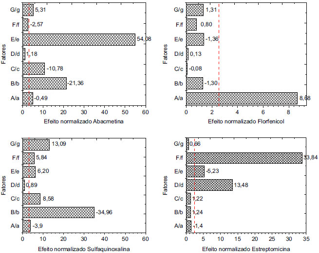 A significância dos efeitos foi interpretada graficamente e estatisticamente. A análise dos resultados foi feita mediante a construção do gráfico de Pareto (Figura 1), no qual os efeitos padronizados são calculados mediante o quociente do efeito de cada fator e o erro associado. Para considerar a significância estatística destes fatores, o valor do efeito padronizado foi comparado com o valor de tcrítico tabelado (α=0,05) para oito graus de liberdade (linha vermelha da Figura 1). O resultado obtido para os diferentes fármacos avaliados revela a importância deste parâmetro de validação, pois apesar do método ser devidamente desenvolvido e validado, nem sempre ele pode ser considerado robusto.