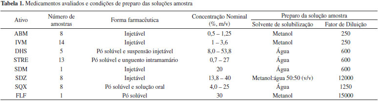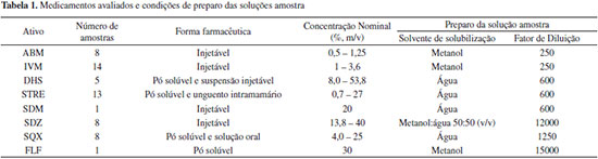PARTE EXPERIMENTAL Reagentes e materiais Todos os reagentes utilizados foram de grau de pureza analítica. Os solventes utilizados foram de grau HPLC e no preparo de soluções foi utilizada água purificada em sistema Milli-Q - 18,2 MΩ cm (Millipore, EUA). As soluções e solventes foram filtrados em membrana de PTFE de 0,22 µm, acopladas a filtros de seringa ou sistema de filtração (Millipore, EUA), respectivamente. Padrões dos fármacos Os padrões de abamectina B1a e B1b (ABM), 98,7%, ivermectina B1a e B1b (IVM), 97,0%, sulfadimetoxina sódica (SDM), 99,0%, e sulfaquinoxalina (SQX), 95,0%, foram adquiridos da Sigma-Aldrich (China). Florfenicol (FLF), 100%, glicose 99,0%, sulfadiazina (SDZ), 99,0%, sulfato de estreptomicina (STRE) potência 758 µg mg-1 e sulfato de diidroestreptomicina (DHS), 98,0%, foram adquiridos da Sigma-Aldrich (EUA). Instrumentação Cromatógrafo 1 (HPLC-DAD): Cromatógrafo a líquido de alta eficiência, Agilent série 1200, composto por sistema de bombeamento quaternário modelo G1311A, forno para coluna modelo G1316A e injetor automático modelo G1329A, detector espectrofotométrico por arranjo de fotodiodos (DAD), cela de 8 µL de volume, 10 nm de caminho óptico, modelo G1315D e sistema de aquisição e tratamento de dados com software ChemStation (Agilent, EUA). Cromatógrafo 2 (HPLC-PAD): Cromatógrafo de íons modular 871 Advance Bioscan, Metrohm (Suíça), composto por sistema de bombeamento 709 IC de duplo pistão com tubulações de PEEK, válvula de injeção e alça de amostragem de 20 µL, detector eletroquímico (PAD) equipado com uma célula amperométrica do tipo wall jet (volume do detector de 0,7 µL) com um eletrodo de trabalho de ouro (8,32 mm de diâmetro), um eletrodo do referência de tipo sólido (patenteado pela Metrohm) e um eletrodo auxiliar de aço inox. Cromatógrafo 3 (HPLC-DAD): Cromatógrafo a líquido de alta eficiência, Thermo Accela (Thermo, EUA), composto por sistema de bombeamento quaternário modelo Surveyor LC PLUS, injetor automático modelo Surveyor PLUS, dotado de controle de temperatura para amostras e forno de colunas integrado, detector espectrofotométrico por arranjo de fotodiodos modelo Surveyor PDA PLUS, cela de 10 µL e sistema de aquisição e tratamento de dados com software ChromQuest 5.0 (Thermo, EUA). Amostras As amostras de medicamentos veterinários foram adquiridas junto ao comércio ou de indústrias nacionais (Brasil), nos anos de 2010 a 2014. No total, foram adquiridas 55 amostras, sendo que três das amostras continham uma combinação de dois fármacos, STRE e DHS. O número de amostras e a forma farmacêutica de cada insumo ativo estão detalhados na Tabela 1, assim como a concentração nominal e o solvente para solubilização da amostra.