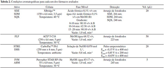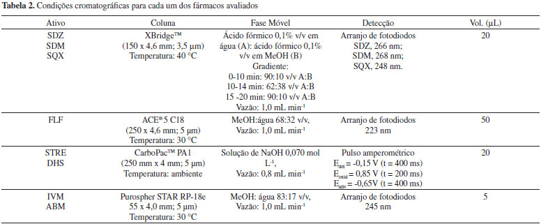 PROCEDIMENTO EXPERIMENTAL Na Tabela 2 são apresentadas as condições cromatográficas otimizadas, levando em consideração os parâmetros de conformidade do sistema, para cada um dos ativos avaliados no procedimento de validação. As sulfonamidas (SDZ, SDM e SQM)24 e o florfenicol foram analisados no cromatógrafo 1.22 Os aminoglicosídeos (STRE e DHS) e as avermectinas (ABM e IVM) nos cromatógrafos 2 e 3, respectivamente. Uma vez que os aminoglicosídeos não apresentam cromóforo, estes foram quantificados com um detector de pulso amperométrico.25