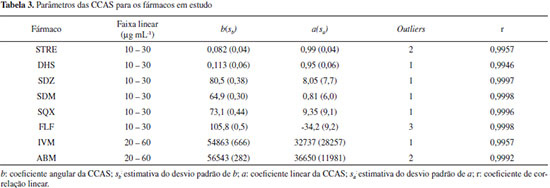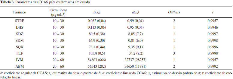 Validação dos métodos Seletividade Soluções intermediárias de cada padrão de fármaco foram preparadas na concentração de 100 µg mL-1 nos seguintes meios: 0,1 mol L-1 ácido clorídrico, 0,1 mol L-1 hidróxido de sódio, 3% v/v peróxido de hidrogênio e em água submetidas à temperatura de 60 ºC (aquecimento em banho-maria). Estas soluções, após serem previamente diluídas (avermectinas para 40 µg mL-1 e os demais fármacos para 20 µg mL-1), foram analisadas por HPLC, empregando as condições descritas na Tabela 2, após 1 hora e 24 horas do preparo das soluções. Em seguida foram analisadas soluções padrão recém-preparadas. Foi avaliada a pureza do pico cromatográfico do fármaco (no caso do detector de arranjo de fotodiodos) em três pontos: início, meio e final do pico, e a eluição de produtos de degradação que pudessem causar interferência. Para os ativos analisados usando a detecção eletroquímica (STRE e DHS) não foi possível realizar a avaliação da pureza do pico, pois o potencial de detecção é mantido constante. Linearidade Foram construídas curvas analíticas (CCAS, curvas de calibração do analito em solução) para cada fármaco usando cinco níveis de concentração (I=5), e em sextuplicata independente de preparo (J=6), seguindo o intervalo de 50 a 150% em relação ao ponto médio da curva selecionado (de 20 µg mL-1 para as sulfonamidas, aminoglicosideos e florfenicol e 40 µg mL-1 para ivermectina e abamectina). As CCAS foram ajustadas pelo método dos mínimos quadrados ordinários (MMQO), após terem sido eliminados valores extremos (outliers) identificados pelo teste de significância dos resíduos padronizados de Jacknife e ter sido comprovada a homocedasticidade da curva pelo teste de Levene.26 As equações das retas foram expressas como: y=a +b×C, na qual C é a concentração de cada fármaco em µg mL-1 e y a área do pico cromatográfico. Os valores de a e b correspondem aos coeficientes linear e angular, respectivamente. Também foram estimadas as incertezas (estimativas dos desvios padrão) de a e b e o coeficiente de regressão linear (r, linearidade). A sensibilidade do método foi obtida pelo coeficiente angular da curva analítica. Ainda, foram plotados os gráficos de resíduos para avaliar possíveis tendências. Efeito matriz de amostra As amostras de medicamentos foram previamente diluídas com solvente conforme descrito na Tabela 1 a uma concentração aproximada de 40 µg mL-1 para as avermectinas e 20 µg mL-1 para os aminoglicosídeos, FLF e sulfonamidas (com base nas informações do fabricante). Estas soluções foram analisadas por padronização externa usando a CCAS e pelo método de adição de padrão (AP). Para o método de AP as amostras contendo avermectinas foram fortificadas com os padrões analíticos nas concentrações de 0; 5,0; 10,0; 15,0 e 20,0 µg mL-1 e as demais amostras contendo florfenicol, sulfonamidas e aminoglicosídeos com 0; 2,5; 5,0; 7,5 e 10,0 µg mL-1. Todas as análises foram realizadas em sextuplicatas independentes. Os resultados foram avaliados de duas formas distintas: