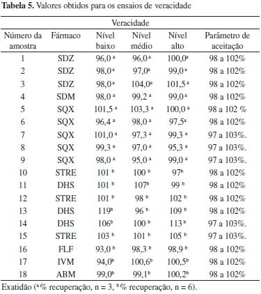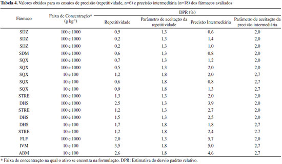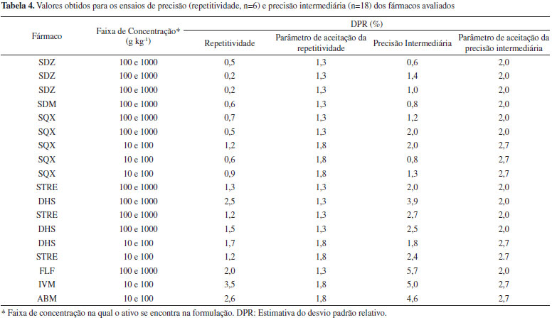 RESULTADOS E DISCUSSÃO Neste trabalho, a validação dos métodos cromatográficos visando a determinação de ABM, IVM, SDM, SQX, SDZ, FLF, STRE e DHS em medicamentos veterinários foi realizada de acordo com as orientações do Guia de Validação e Controle de Qualidade Analítica - Fármacos em Produtos para Alimentação Animal e Medicamentos Veterinários.13 No entanto, durante a operacionalização da validação, alguns critérios e procedimentos não puderam ser seguidos na sua totalidade, como no caso da seletividade, precisão (repetitividade e reprodutibilidade intralaboratorial) e veracidade, sendo necessárias adaptações para dar prosseguimento à validação, os quais são discutidos a seguir. A determinação do fármaco em medicamentos veterinários, matérias primas, produtos para alimentação animal e matrizes de origem biológica, segundo especificado no Guia de Validação do MAPA se enquadra na categoria I (testes quali-quantitativos). Nesta categoria devem ser avaliados os seguintes parâmetros de validação do procedimento analítico: seletividade, efeito matriz, linearidade, precisão, veracidade/recuperação e robustez. Anterior ao processo de validação, os métodos cromatográficos para cada fármaco foram desenvolvidos e as condições ótimas estabelecidas estão apresentadas na Tabela 2. Para a otimização dos métodos foram levados em consideração os parâmetros de conformidade do sistema cromatográfico: resolução (Res), fator de alargamento (TF) e/ou fator de assimetria (As), número de pratos (N) e fator de retenção (k). Os valores a serem aceitos foram os recomendados nas monografias farmacopeicas para cada insumo farmacêutico ativo e, na ausência destes, foram preconizados os valores ou faixas mínimos sugeridos no Capítulo 621 da Farmacopeia Americana:23 Rs>2; 0,9 <As< 1,2; k>2 e N >2000. Ainda, anterior ao processo de validação foram realizados estudos da estabilidade das soluções estoque e de trabalho para cada fármaco (resultados não apresentados). A solução foi considerada estável quando a degradação do fármaco foi menor do que 2% em relação a uma solução recém-preparada. Todas as soluções foram usadas dentro do período de sua estabilidade, respeitando as condições de estocagem. Seletividade A seletividade do método analítico é um parâmetro importante a ser avaliado, uma vez que visa a comprovar que o procedimento analítico em uso permite determinar com confiabilidade o analito na presença da matriz (excipiente do fármaco) sem interferência de concomitantes ou presença de produtos de degradação. O teste de seletividade descrito no guia de validação do MAPA13 segue em íntegra a recomendação do ICH16, o qual prevê a avaliação deste parâmetro para fins de identificação e quantificação. Para fins de identificação o Guia13 recomenda que sejam avaliados compostos com estruturas relacionadas ao fármaco que podem estar presentes na formulação e que esses sejam escolhidos com base em evidências científicas da possível presença destes. Essa recomendação é razoável de ser atendida por laboratórios que produzem o medicamento e que conhecem o processo de síntese. No entanto, para laboratórios analíticos ou de fiscalização essa etapa é difícil de ser cumprida e praticamente não existem publicações científicas disponíveis sobre possíveis impurezas ou concomitantes em medicamentos veterinários. Para o teste de seletividade com finalidade quantitativa o Guia sugere a comparação de resultados obtidos de amostras contaminadas com quantidades apropriadas de impurezas ou excipientes de amostras não contaminadas. Ainda, indica que quando a impureza ou o padrão do produto de degradação não estiver disponível, pode-se comparar os resultados do teste das amostras contendo impurezas ou produtos de degradação com os resultados de um segundo procedimento bem caracterizado. Nesta comparação devem ser incluídas amostras armazenadas sob condições de estresse (luz, calor ou meios ácido, básico ou oxidante). Considerando que várias empresas comercializam um mesmo ativo em uma mesma forma farmacêutica, mas com diferentes excipientes (cuja composição não é revelada), fica praticamente inviável, embora tecnicamente esse procedimento seja correto, para um laboratório de fiscalização avaliar possíveis impurezas e/ou produtos de degradação para uma forma farmacêutica de cada empresa que comercializa o medicamento. Por exemplo, no caso de medicamentos contendo ivermectina existem aproximadamente 50 empresas que comercializam no país mais de seis formulações diferentes, ou seja, em torno de 300 produtos no mercado. Sendo assim, cada formulação teria que ser exposta a cinco condições de estresse, o que representaria, em uma estimativa, em torno de 1500 amostras a serem analisadas (4500 determinações em triplicata) só para a determinação deste parâmetro. Outro ponto importante a destacar é que para métodos cromatográficos é essencial que sejam avaliados os parâmetros de conformidade do sistema (system suitability). Em nenhum momento o Guia faz referência a esse item. É recomendável que a conformidade do sistema seja avaliada antes da validação ou paralelamente à seletividade. Se existir co-eluição de algum composto interferente, o procedimento do método necessita ser modificado no sentido de permitir a separação do analito dos demais compostos. No presente trabalho a seletividade foi avaliada em termo do sinal proveniente da análise da amostra processada e do padrão analítico de interesse. A identidade foi confirmada pela pureza do pico cromatográfico em três pontos do pico. Ainda, em termos de quantificação foi avaliada a resolução do pico do analito com os produtos de degradação formados após exposição dos padrões de ABM, IVM, SDM, SQX, SDZ e FLF a condições de estresse (0,1 mol L-1 ácido clorídrico, 0,1 mol L-1 hidróx
