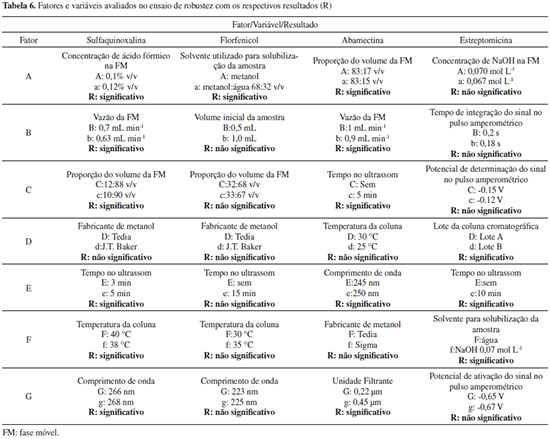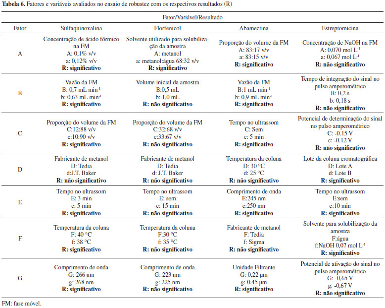 Segundo recomendações do Guia de Validação do MAPA,13 o critério de aceitação de veracidade/recuperação para o teor do fármaco nas amostras é dependente da concentração do mesmo na formulação e previsto pela Equação de Horwitz. Segundo este critério, apenas 4 das 18 amostras analisadas se enquadram nos três níveis de fortificação simultaneamente. As demais amostras encontram-se fora da faixa de recuperação aceita, em pelo menos um dos níveis de fortificação avaliados. Se considerarmos uma faixa aceitável de recuperação de 95% a 105%, apenas duas amostras ficariam fora da faixa aceitável, que são duas amostras de aminoglicosideos (DHS) analisadas por HPLC com detector eletroquímico. Robustez A definição do termo robustez e o procedimento a ser empregado não são harmonizados entre os guias de validação de métodos e nem sempre é mandatória a sua avaliação. Segundo o Guia do MAPA "o estudo da robustez de um procedimento analítico procura avaliar o quão sensível o resultado analítico é às variações nas condições experimentais do procedimento analítico."13 Segundo a Comunidade Europeia29 a robustez (robustness) é a susceptibilidade de um método de ensaio às alterações das condições experimentais, as quais podem ser expressas como tipos de amostras, analitos, condições de armazenamento, condições ambientais ou de preparo de amostra em que o método pode ser aplicado tal como apresentado ou com pequenas alterações específicas. O Guia de Validação do MAPA13 recomenda que o teste de robustez seja realizado utilizando a abordagem clássica, variando um fator de cada vez, ou utilizando a abordagem do planejamento fatorial completo ou fracionário. Contudo, o Guia não propõe quais parâmetros podem ou devem ser avaliados nos testes de robustez de métodos analíticos e nenhuma menção é dada referente a testes estatísticos para avaliar os resultados. Já o Guia do INMETRO28 recomenda o Teste de Youden para determinar a robustez do método. Neste trabalho a avaliação da robustez foi realizada para quatro fármacos (um representante para cada classe de antimicrobiano e um antiparasitário) e foi escolhido o teste de Youden,30 visto que neste experimento é possível examinar, simultaneamente, os efeitos de alterações em sete diferentes fatores do método. Na Tabela 6 são mostrados os fatores e as variáveis selecionados para cada ativo, os quais foram variados levemente em dois níveis (tratamentos) e os resultados (significância dos efeitos) após tratamento estatístico. Foram elencados fatores que poderiam causar alterações no resultado.