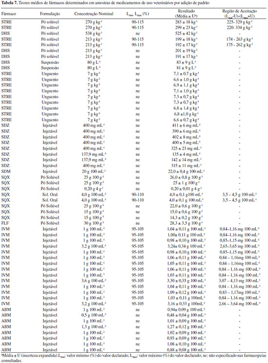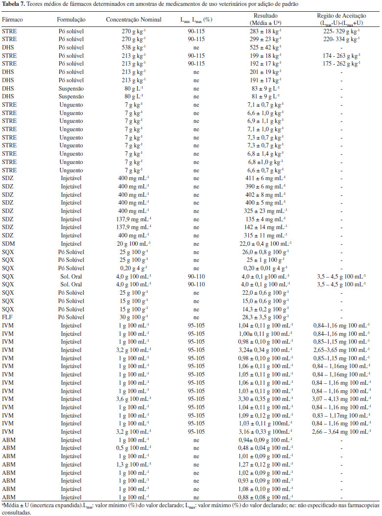 Para a interpretação dos resultados de medição, o Manual de Garantia da Qualidade Analítica do MAPA27 recomenda o estabelecimento de regras de decisão contemplando bandas de segurança, a fim de evitar a probabilidade de falsa rejeição (falsa não conformidade, falso não conforme, falso positivo) ou a probabilidade de falsa aceitação (falsa conformidade ou falso negativo). Assim sendo, o resultado de quantificação obtido é comparado com uma faixa ou intervalo. O estabelecimento destas faixas leva em consideração os valores de referência estabelecidos nas farmacopeias (mínimo e máximo) e a incerteza expandida (U) com fator de abrangência (k) de 2 calculada para cada formulação. Cabe destacar que a Farmacopeia Brasileira21 não contempla monografias específicas para medicamentos de uso veterinário. Dos fármacos avaliados apenas a estreptomicina na formulação em solução injetável e em pó estéril tem monografia descrita na Farmacopeia Brasileira, indicando os limites de aceitação de no mínimo 90,0% e, no máximo 115,0% da quantidade declarada no rótulo do medicamento, sendo essa mesma faixa especificada pela Farmacopeia Americana.23 No entanto, a resolução da ANVISA RDC nº 37 de 200931 estabelece que na ausência de monografia oficial do fármaco, formas farmacêuticas, correlatos e métodos gerais inscritos na Farmacopeia Brasileira poderão ser adotados os intervalo estabelecidos em outras monografias oficiais. Sendo assim, neste trabalho foram também consultadas as Farmacopeias Americana e Britânica. Nestas Farmacopeias foram encontradas monografias para sulfaquinoxalina solução oral23 e ivermectina formulação injetável.22,23 Para os demais medicamentos (35 ao total) não existem, até o presente, monografias disponíveis nestas farmacopeias e, portanto, não foi possível avaliar se o fármaco no medicamento está em conformidade ou não com o teor declarado. Para a SDZ, embora não se tenha monografia disponível, observou-se discrepância entre o valor determinado (325 mg mL-1 e 315 mg mL-1) e o nominal (400 mg mL-1) para duas amostras injetáveis, o que leva a indicar uma não conformidade. As amostras analisadas que tem monografias descritas (20 no total), contendo os fármacos estreptomicina, sulfaquinoxalina e ivermectina tiveram seus resultados dentro da região de aceitação e, portanto, podem ser declaradas conformes. Vale a pena observar que a região de aceitação inclui a faixa especificada descrita na monografia e a incerteza expandida do método o que leva a uma ampliação considerável da faixa de aceitação final, em torno de ±20%.