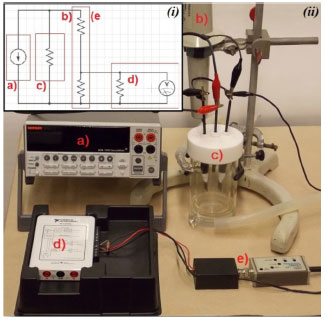 ![]() Figura 1. i) O circuito geral do sistema. ii) O sistema real para cronopotenciometria de alta velocidade. Fonte DC em (a), a ponta de prova (b) (e), a célula eletroquímica (c), o DAQ (d)