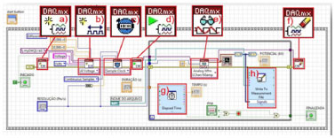![]() Figura 2. O código fonte do instrumento virtual escrito. Temos em destaque as estruturas, create task (a), configure channel (b), configure timing (c), start task (d), read (e), clear task (f), elapsed time (g) e write to mesurement file (h)