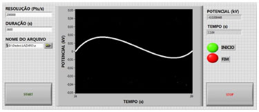 O código fonte é divido em duas funções: a configuração da medida a ser realizada e a sequência de medida. A configuração compreende as estruturas (na Figura 2), create task (a), configure channel (b) e configure timing (c). Em create task, o LabView verifica se existe conexão entre o DAQ e o computador e se a mesma está funcionando de acordo com parâmetros previamente escritos na estrutura de create task. Na estrutura configure channel, o LabView atribui um nome ao canal analógico do DAQ utilizado na medida e, além disso, define-se o referencial elétrico que o canal utiliza na medida, a grandeza física medida pelo canal e a escala utilizada para representá-la. Finalizando a configuração da medida, temos a estrutura configure timing, que define qual é a referência de contagem de tempo utilizada pelo LabView durante a medida, a frequência de medição e, por fim, quantos pontos da medida ficam armazenadas temporariamente no buffer de memória que o LabView utiliza para criar o arquivo de armazenamento de dados permanente. A frequência da medida é um dos parâmetros de entrada do instrumento virtual. A sequência da medida contém as estruturas (Figura 2), start task (d), read (e), clear task (f), elapsed time (g), write to file (h) e estruturas de monitoramento da medida. Nesta sequência estão presentes estruturas que se executam uma única vez, como start task e clear task e outras que estão em loop, como read, elapsed time, write to file e os monitores da medida. A estrutura start task depende dos parâmetros de saída das estruturas descritas na etapa de configuração da medida. Se tudo estiver de acordo com as condições de erro previamente escritas em create task a sequência de medida se inicia. Em elapsed time temos dois contadores virtuais de tempo referenciados à estrutura configure timing, que indicam o tempo de uma iteração da sequência de medida. Seu papel é indicar por quanto tempo esta sequência fica ativa e ao término dela finalizar a tarefa por meio de uma constante booleana (verdadeiro ou falso). A estrutura read coleta os dados indicados pela estrutura configure channel em forma de uma série temporal do canal analógico e os armazena no buffer de memória temporário, com um tamanho na RAM do computador e por um tempo máximo especificados no código fonte. Os dados armazenados no buffer são utilizados pela estrutura write to file para gerar um arquivo tipo texto que salva os dados obtidos pela medida de forma permanente em um diretório do disco rígido do computador. A cada iteração o buffer temporário de memória e os monitores da medida precisam ser renovados e a estrutura clear task indica que esta ação deve ser realizada. Por fim, temos estruturas que monitoram o andamento da medida, como um chart, um marcador de tempo e um marcador da diferença de potencial entre os eletrodos ligados ao canal analógico. A aparência do instrumento virtual para o usuário é amigável, na qual podem ser vistos botões que iniciam e finalizam a medida, campos para a configuração da medida (resolução, duração e o diretório do arquivo da medida) e estruturas de monitoramento da medida (um chart, indicadores de início, fim, tempo decorrido e o valor de potencial em dado instante). A Figura 3 apresenta a tela do instrumento virtual em operação. É com esta tela que o usuário interage ao utilizar o instrumento virtual desenvolvido pelos autores deste trabalho. Em outras palavras, não existe nenhuma necessidade de programação por conta do usuário para utilização do instrumento virtual proposto pelos autores.