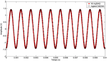 RESULTADOS E DISCUSSÃO Com o hardware e o software preparados, realizamos experimentos testes com sistemas bem comportados. Para esta finalidade, utilizamos a função "gerador de sinais" de um FRA (Frequency Response Analyser) modelo 1260A® da SolartronTM para criar um sinal senoidal com amplitude de 1,47 V pico a pico e 1 kHz de frequência. Medimos este sinal com um osciloscópio AgilentTM modelo 54624A® e comparamos o resultado com o sistema construído neste trabalho. A Figura 4 compara os resultados obtidos com os dois sistemas de medidas.