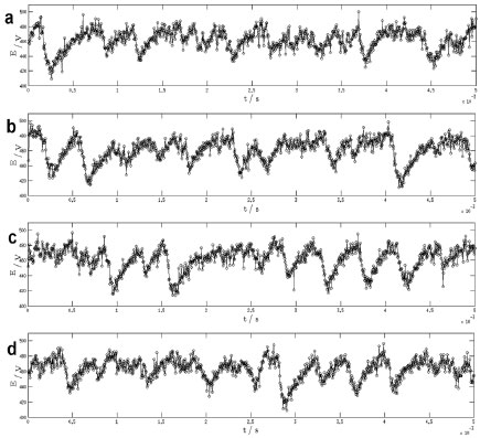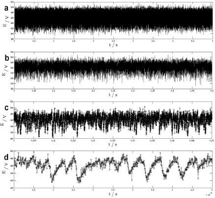 ![]() Figura 6. Intervalos de 0.005 s ao longo da cronopotenciometria. Início do registro em: (a) 1800 s, (b) 2000 s, (c) 2600 s e (d) 3000 s