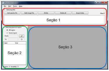 RESULTADOS E DISCUSSÃO Funções da versão desktop O ChemoStat atua em dados espectrais a partir do infravermelho e na quimiometria de imagens, a partir da decomposição das camadas de cor por pixels. A tela principal do software ChemoStat possui 3 seções, ilustradas na Figura 1.