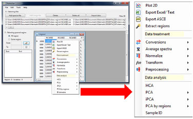 Aplicação do software na análise de espectros de infravermelho A importação de dados ocorre por meio de arquivos de espectros gerados pelo espectrofotômetro de infravermelho Perkin-Elmer no formato "sp". Para outros equipamentos os dados devem ser exportados em "asc" (ASCII), além da opção da área de transferência, teclas "Control+C" (copiar) e "Control+V" (colar). Ao serem importados, os dados preenchem uma grade ou matriz de dados, ao clicar com o botão direito do mouse, é apresentado um menu com as opções de plotagem de gráficos, transformações, análises e exportação dos dados, como demonstra a Figura 2.