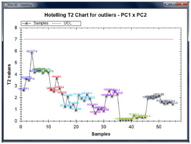 ![]() Figura 8. Gráficos de Outliers a partir do T2 de Hotelling do ChemoStat versão desktop