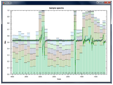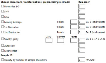 O software possui ferramentas matemáticas de transformação e pré-processamento de sinais, como correções, suavizações e normalizações de acordo com os métodos da 1ª e 2ª derivadas, MSC (Multiple Scatter Correction), SNV (Standard Normal Variate) e método de Savitky-Golay, a partir de dados centrados na média ou escalonados, além de conversões de medidas entre absorbância e transmitância. O software também gera médias para replicatas e organiza classes de amostras por nome. Essa função, chamada de "Sample ID", permite a identificação a partir de cores pré-estabelecidas através da análise sintáxica do nome da amostra. Para que isto ocorra, basta informar o número de caracteres semelhantes entre a denominação das replicatas, conforme ilustrado na Figura 3.
