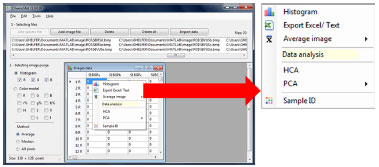 A partir dessa análise, gráficos de scores e loadings são efetuados para cada intervalo de região espectral. Os resultados de todas as análises podem ser exportados para extensão ".xls", ".txt" e ".asc". Já os gráficos, possuem opção de exportação nos formatos de figuras ".bmp", ".png" e ".jpg". Aplicação do software na análise de imagens Na quimiometria de imagens, podem ser analisados dados do histograma R, G e B, ou de cada componente de cor R, G, B, R relativo, B relativo, G relativo, H, S, V, I e L. A importação destes ocorre por meio de arquivos de imagens nos formatos "bmp", "jpg" e "png", além da opção da área de transferência, teclas "Control+C" (copiar) e "Control+V" (colar), conforme ilustra a Figura 10.