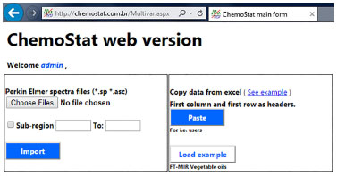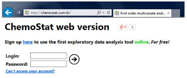 As técnicas desenvolvidas para quimiometria de imagens foram: Análise por Agrupamento Hierárquico (HCA), Análise por Componentes Principais (PCA), detecção de amostras anômalas (outliers) pelo método T2 de Hotelling e visualização do histograma. Da mesma forma como nos resultados dos espectros de infravermelho, os resultados das análises de imagens podem ser exportados para extensão ".xls", ".txt" e ".asc". Já os gráficos, possuem opção de exportação nos formatos de figuras ".bmp", ".png" e ".jpg". Funções da versão web (online) O acesso ao software se dá pelos endereços "http://www.chemostat.com.br" e "http://www.chemostat.net", cuja tela de entrada apresenta a opção de registro de usuário (link "here"), e para usuários já registrados, as opções de login (e-mail de entrada), "password" (senha de entrada), "can't access your account" (recuperação de senha), para entrada no sistema.
