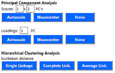O método de PCA para "Scores" é executado através dos botões "Autoscale", cujos dados serão previamente autoescalados; "Meancenter", centrados na média; e "None", para nenhum pré-processamento. Em todos os casos, quando pressionados, uma nova janela abrirá com o gráfico de scores conforme os campos "PC's" preenchidos. O método de PCA para "Loadings" ocorre de forma semelhante à opção de "Scores", no que diz respeito aos botões "Autoscale", "Meancenter" e "None". A tela padrão foi configurada para PC1, podendo ser alterada manualmente. Já o método de HCA, calculado pela distância euclidiana, é executado através dos botões "Single-Linkage", "Complete-Linkage" e "Average-Linkage", denominado pelo método de ligação. Em todos os casos, quando pressionado o botão, uma nova janela abrirá com o respectivo dendrograma. A Figura 14 ilustra o detalhe da página web com os botões de análise multivariada.