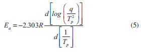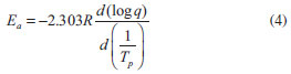 Akiba y col.23 establece que para polibutadienos con alto contenido dobles enlaces 1,2- presentan mayores eficiencias de reticulación, lo que sugiere que las unidades de vinilo de cadena lateral se someten a reacciones de adición más fácilmente que los dobles enlaces en la cadena. Aunque existe una cierta dispersión de resultados en cuanto a la energía de activación calculada por diferentes métodos, en general, los valores obtenidos son coherentes con valores encontrados con polímeros similares.17 Es interesante notar que, si bien la energía de activación es un parámetro cinético que se obtiene por ajustes matemáticos, proporciona una idea clara de la cantidad de reticulación presente en el sistema. Es importante mencionar que el método Kissinger presenta los mismos inconvenientes que el método de Ozawa aplicado a la Tp.