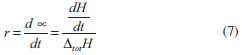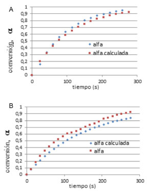 La reproducción de las curvas α vs t mostrado en la Figura 4, presenta una concordancia aceptable entre los valores experimentales y las curvas correspondientes al mecanismo de orden n.