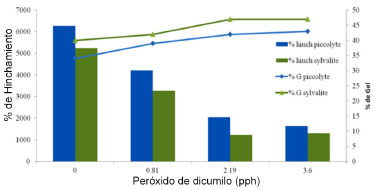 ![]() Figura 1. Efecto del % hinchamiento y % Gel en adhesivos SBR comparando las resinas Piccolyte HM106 y Sylavlite RE100L, a diferentes relaciones de peróxido de dicumilo