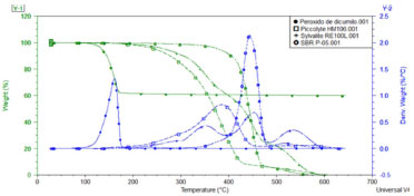 Análisis de estabilidad térmica por TGA Las curvas de TGA presentan la pérdida de peso de las formulaciones en función del aumento de la temperatura. Como se observa en la Figura 2, la descomposición del peróxido de dicumilo inicia aproximadamente a 100 ºC y el copolímero alrededor de 300 ºC, esta información es relevante para asegurar la estabilidad térmica del copolímero siendo más estable que el agente reticulante. La temperatura inicial de descomposición es utilizada para predecir la estabilidad térmica de los materiales.18 La derivada de la curva muestran que la temperatura máxima de descomposición es de 450 ºC para el SBR y de 160 ºC para el peróxido de dicumilo mostrado en la Tabla 3, lo anterior es indicativo que cualquier proceso exotérmico observado por debajo de 200 ºC implica solo la activación de peróxido para formar radicales y formación de redes tridimensionales, resultado del entrecruzamiento. Las derivadas de las curvas termogravimétricas, muestran los datos de descomposición máxima y son utilizados como temperaturas de descomposición.18